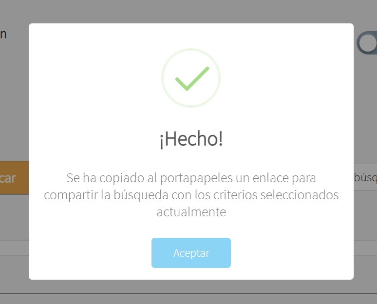Cuando se trate de búsquedas por criterios, una vez introducidos los criterios/filtros de búsqueda que interesen, se puede obtener, mediante un nuevo botón habilitado a tal efecto, un enlace que puede ser remitido a un tercero con el objeto de hacerle llegar esa búsqueda concreta (y los resultados que la misma conlleva, lógicamente). Ese enlace queda copiado al portapapeles y no hay más que pegarlo (CTRL+V o botón derecho del ratón y seleccionar la opción de Pegar) en el medio que se pretenda usar (email, Telegram, Whatsapp, etc.). Recibido el enlace, simplemente habrá que hacer clic en el mismo para recuperar/cargar de nuevo la búsqueda en cuestión y los resultados correspondientes.